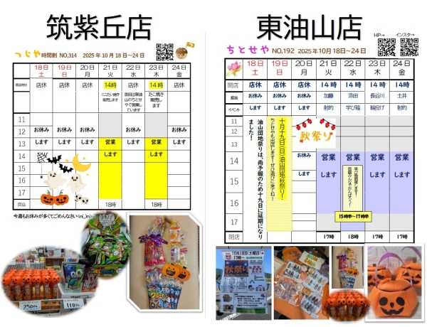 2024.10.18 | トップページに2024年10月19日~のつじや&ちとせやの営業予定をアップしました! |
