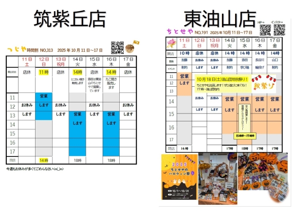 2023.10.06 | トップページに2023年10月7日~のつじや&ちとせやの営業予定をアップしました! |