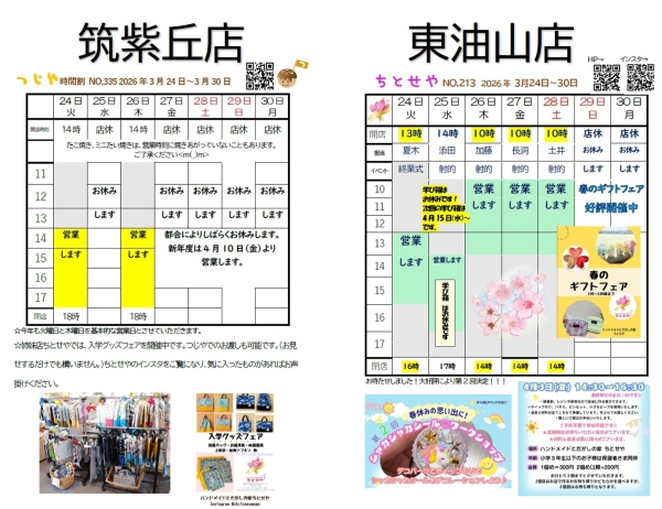 | 2026.03.24 | トップページに2026年3月24日~のつじや&ちとせやの営業予定をアップしました! |