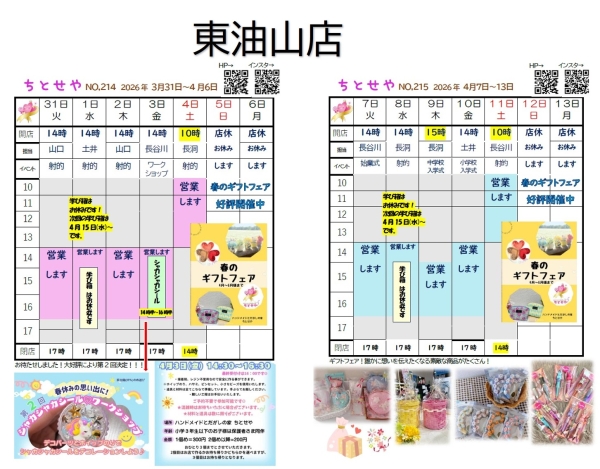 | 2022.02.17 | 「ハンドメイドとだがしの家ちとせや(東油山店)」の「イベント」のページに「入園入学フェア」のお知らせをアップしました! |