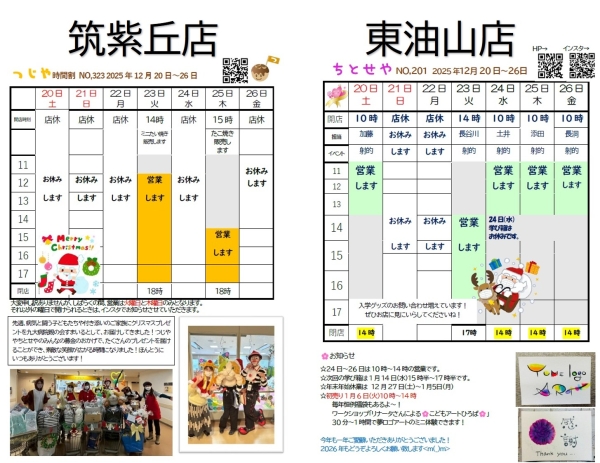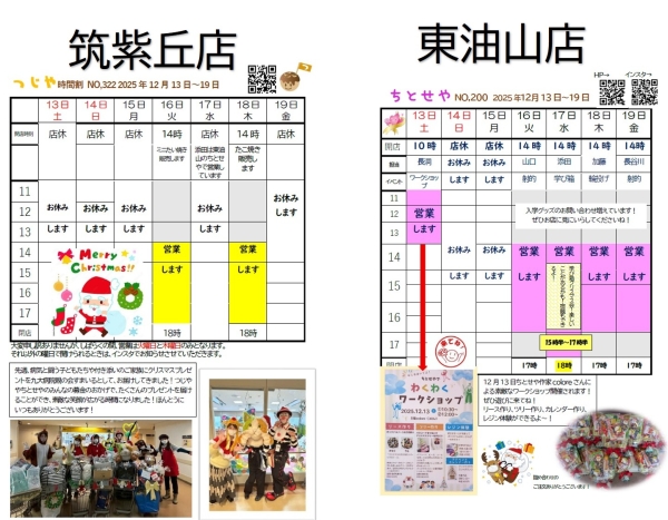 | 2025.12.13 | トップページに2025年12月13日~のつじや&ちとせやの営業予定をアップしました! |
