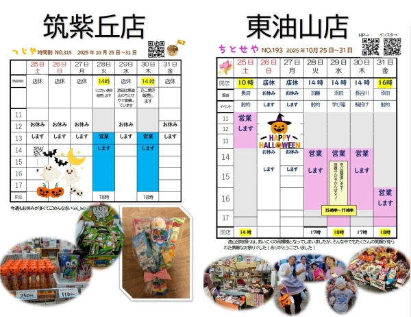 | 2023.10.13 | トップページに2023年10月14 日~のつじや&ちとせやの営業時間をアップしました! |